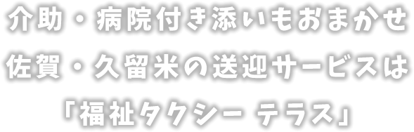 福祉タクシー テラスは、佐賀県佐賀市を拠点に要介護者様や障害をお持ちの方の送迎サービスを行っています。病院や介護施設への送迎、日常の買い物、レジャーなど、どのような目的でもご利用いただけるのが、介護タクシーとの違いです。